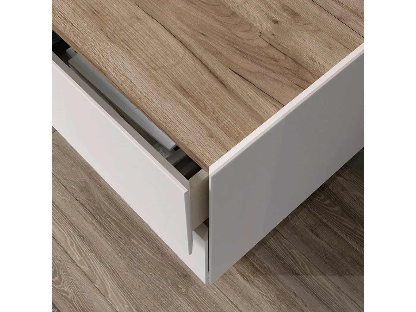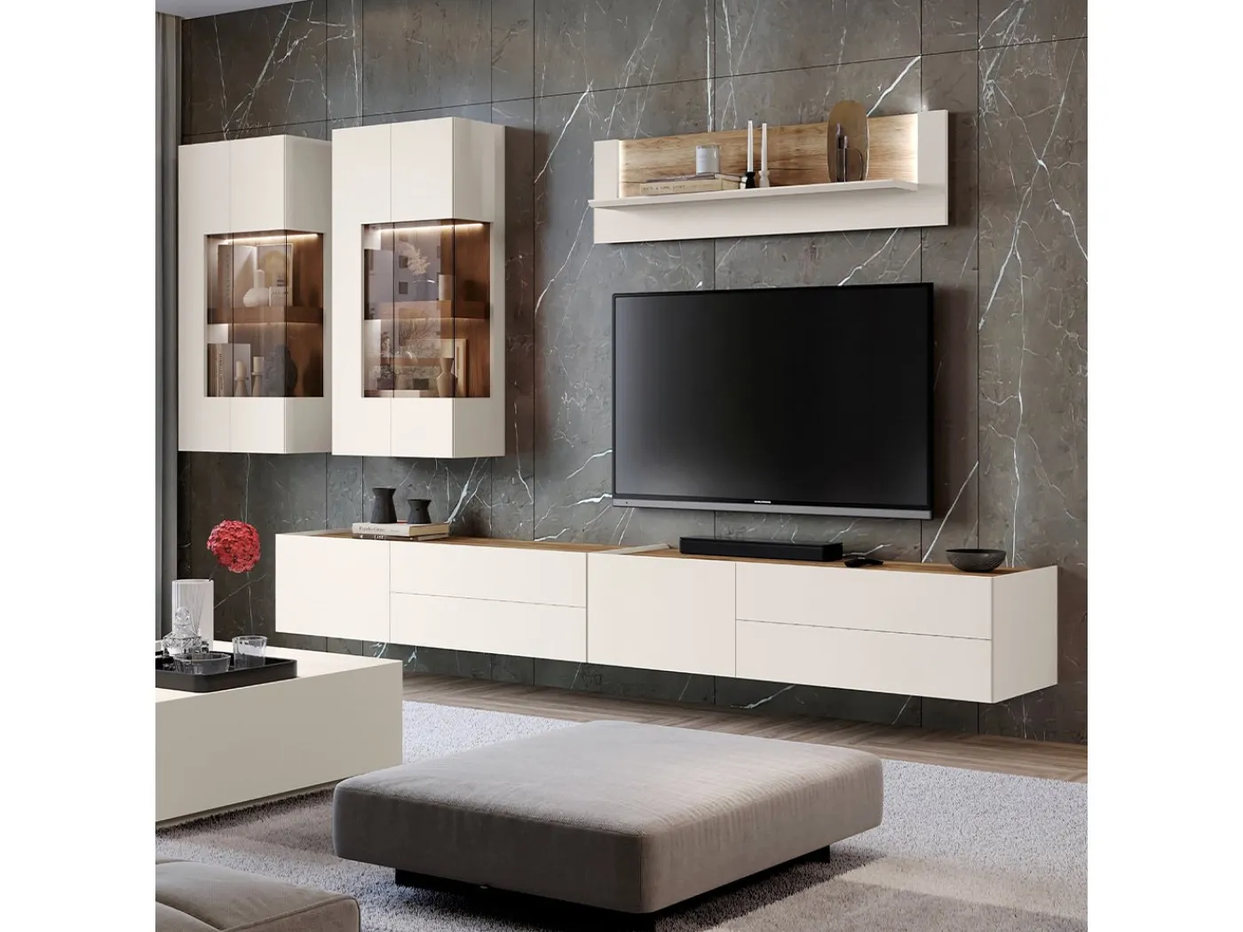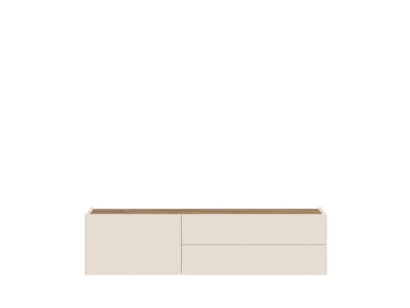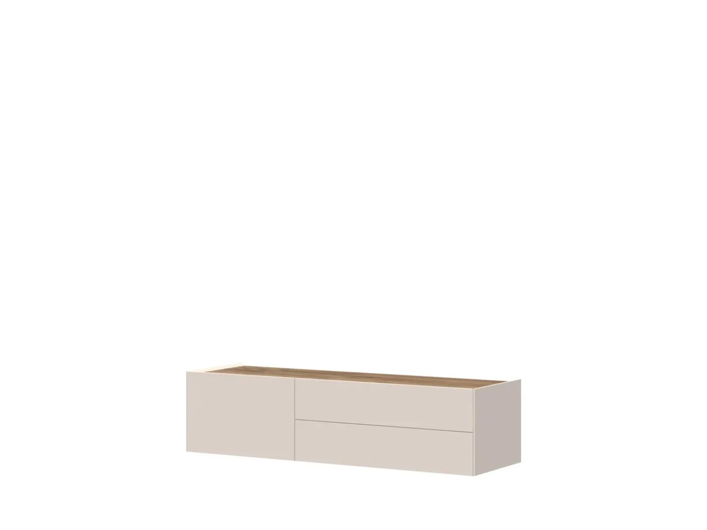 Viseča TV omarica SKY45 združuje modern dizajn, vrhunsko izdelavo in čudovite detajle. Značilnost programa za opremo dnevnih sob SKY45 je spajanje bočnih stranic in ličnic pod kotom 45 stopinj, kar daje pohištvu izjemen karakter. Stranice in ličnice so izdelane iz medijapana in so lakirane z UV lakom s soft-mat površino v barvi kašmirja. Vrhnja plošča omarice je izdelana iz iverala v barvi Tabacco hrast, ki pohištvu daje prijetno toplino.