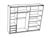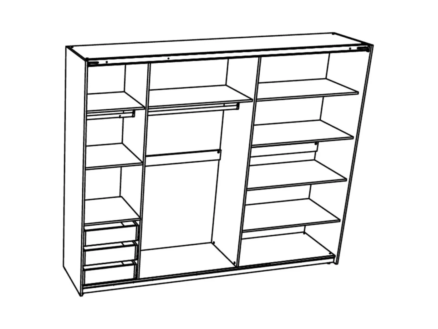 Notranjost omare je razdeljena na 3 dele. Levi del vsebuje 1 polico, 1 palico za obešanje in 3 notranje predale. Sredinski del je opremljen z eno polico ter palico za obešanje. Desni del je opremljen s 4 policami.