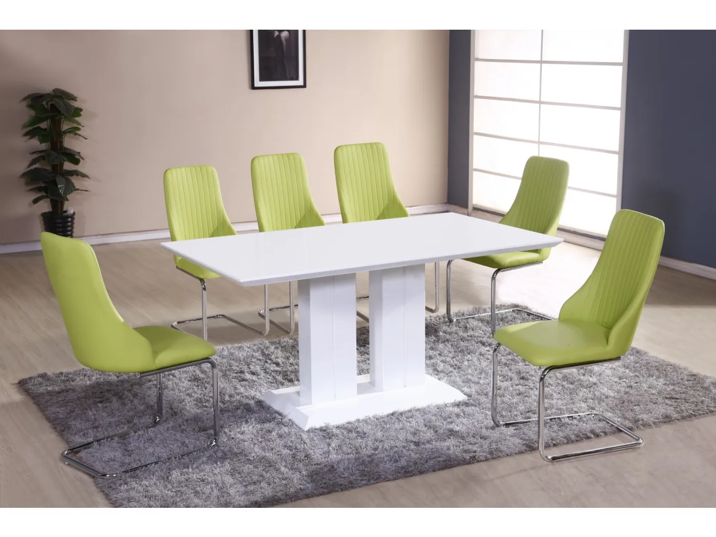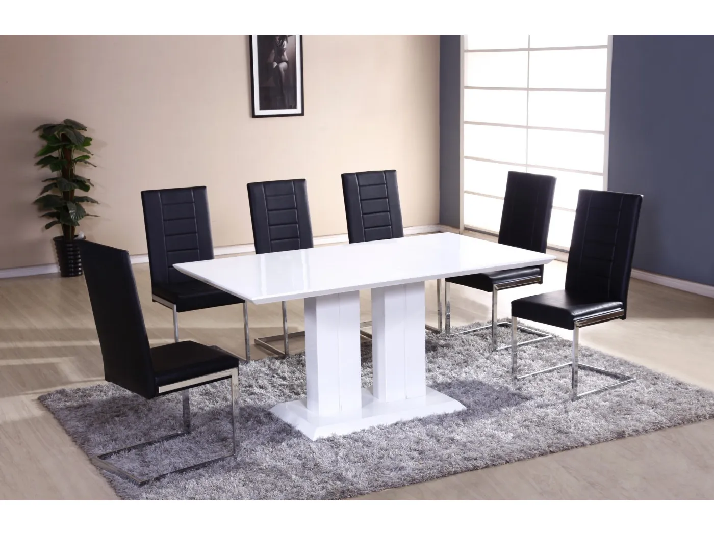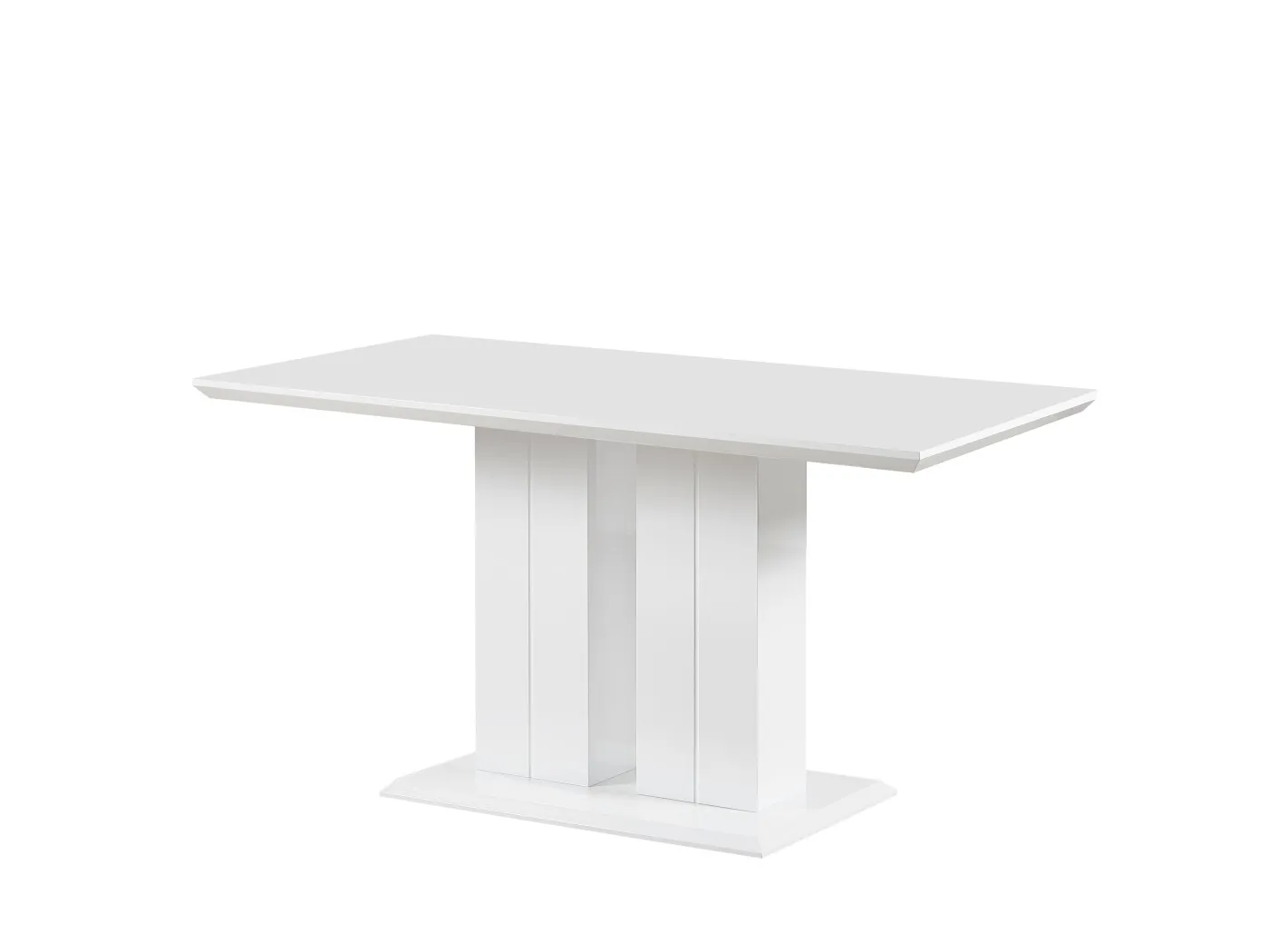 Moderna jedilna miza v beli barvi visok sijaj. Miza ima sredinsko nogo in je fiksna. Zaradi sredinske noge omogoča udobno razporeditev stolov okoli mize. Preprost in eleganten dizajn omogoča, da se miza odlično vklopi v vsako jedilnico. Izdelana je iz materiala MDF.