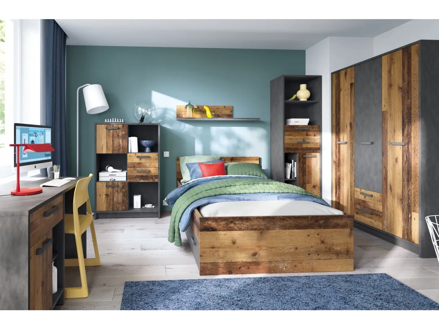 Mladinsko sobo NUBI odlikuje modern in drzen dizajn v kombnaciji imitacije betona in recikliranega lesa. Soba je kakovostno izdelana iz iverne plošče, prevlečene z melaminsko folijo.