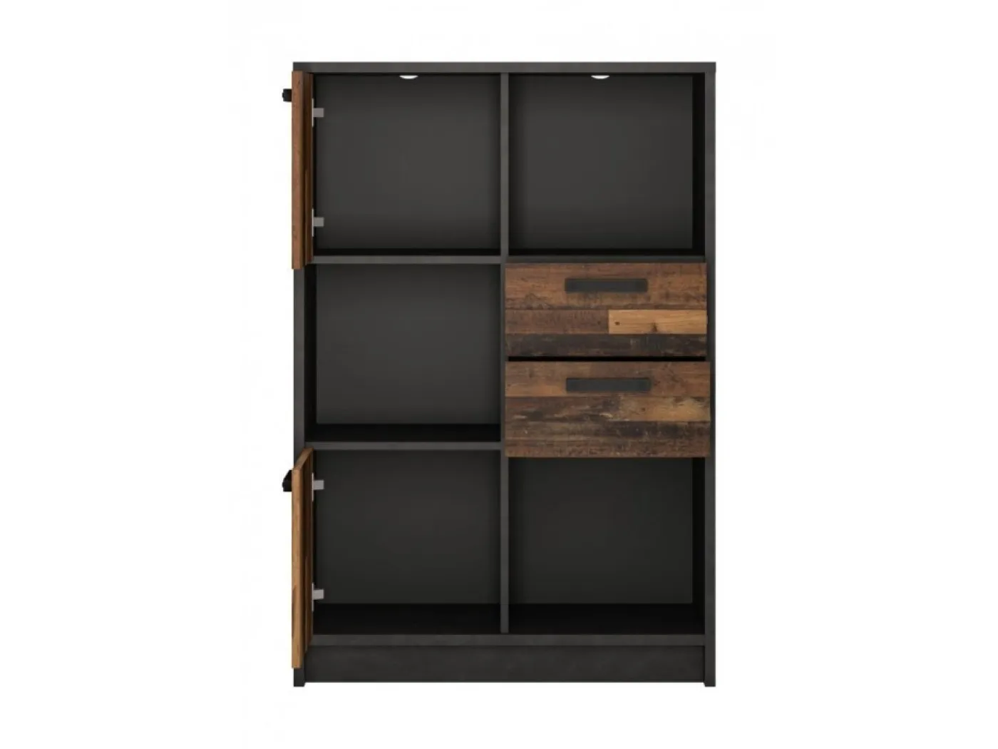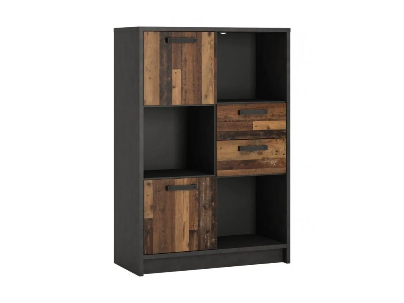 - komoda NUBR02 (dimenzija 87x42x128,7 cm) - Komoda ima 2 predela zaprta z vrati, 2 predala in 3 odprte niše za odlaganje.