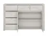 Na levi strani komode se nahajajo 4 predali. Na desni strani komode sta na vrhu 2 predala, spodaj pa je del zaprt z vrati. V delu zaprtem z vrati se nahaja 1 dodatna polica.
