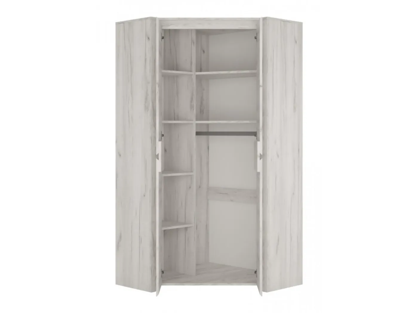Kotna omara Angel typ 21 vam omogoča popoln izkoristek prostora. Zaradi bogato opremljene notranjosti bodo vaša oblačila vedno lepo urejena. Omara je izdelana iz iverne plošče v barvi beli hrast, ki je enostavna za vzdrževanje in odporna na praske. Omaro odlikuje tudi eleganten brezročajni dizajn.