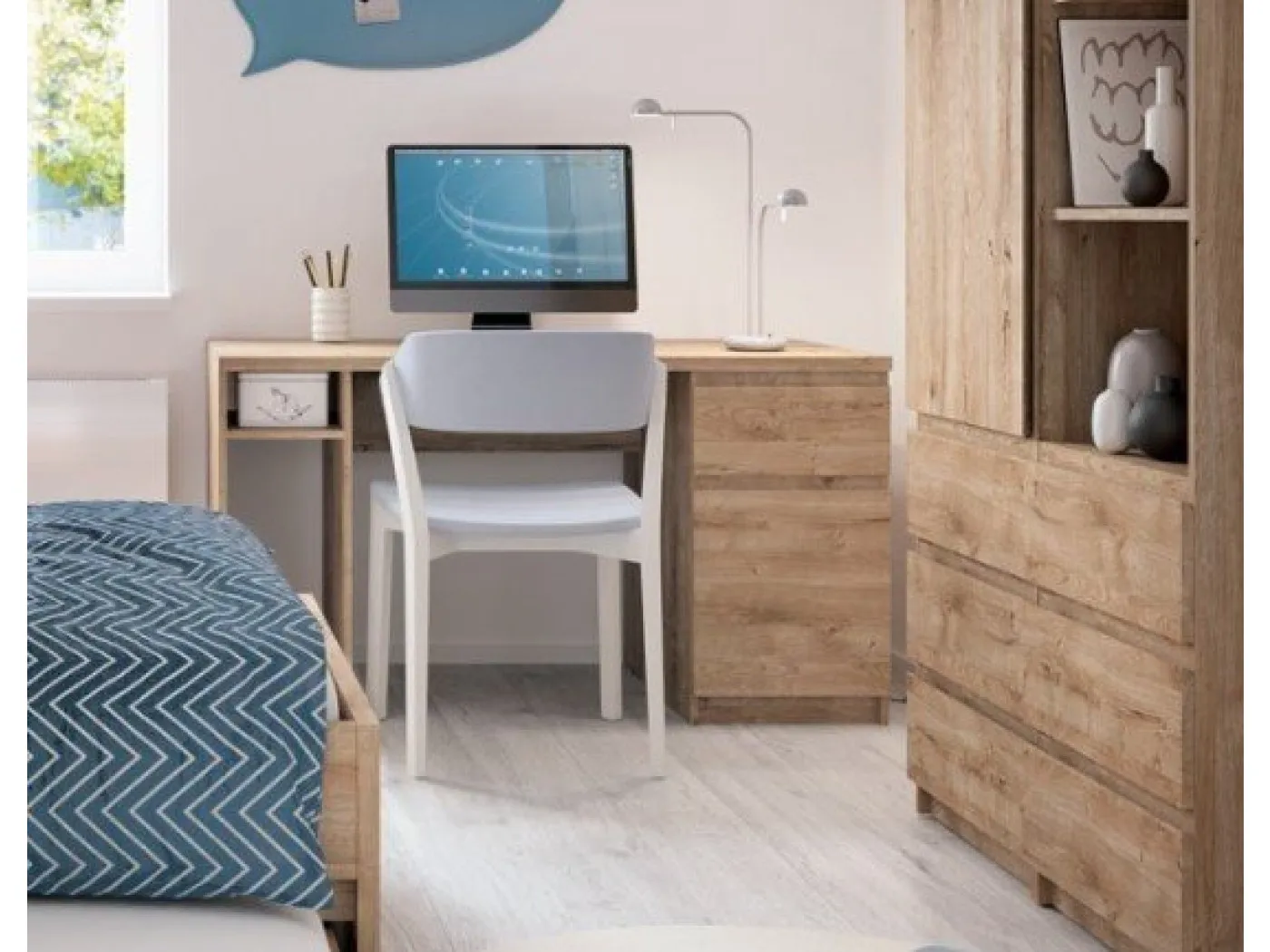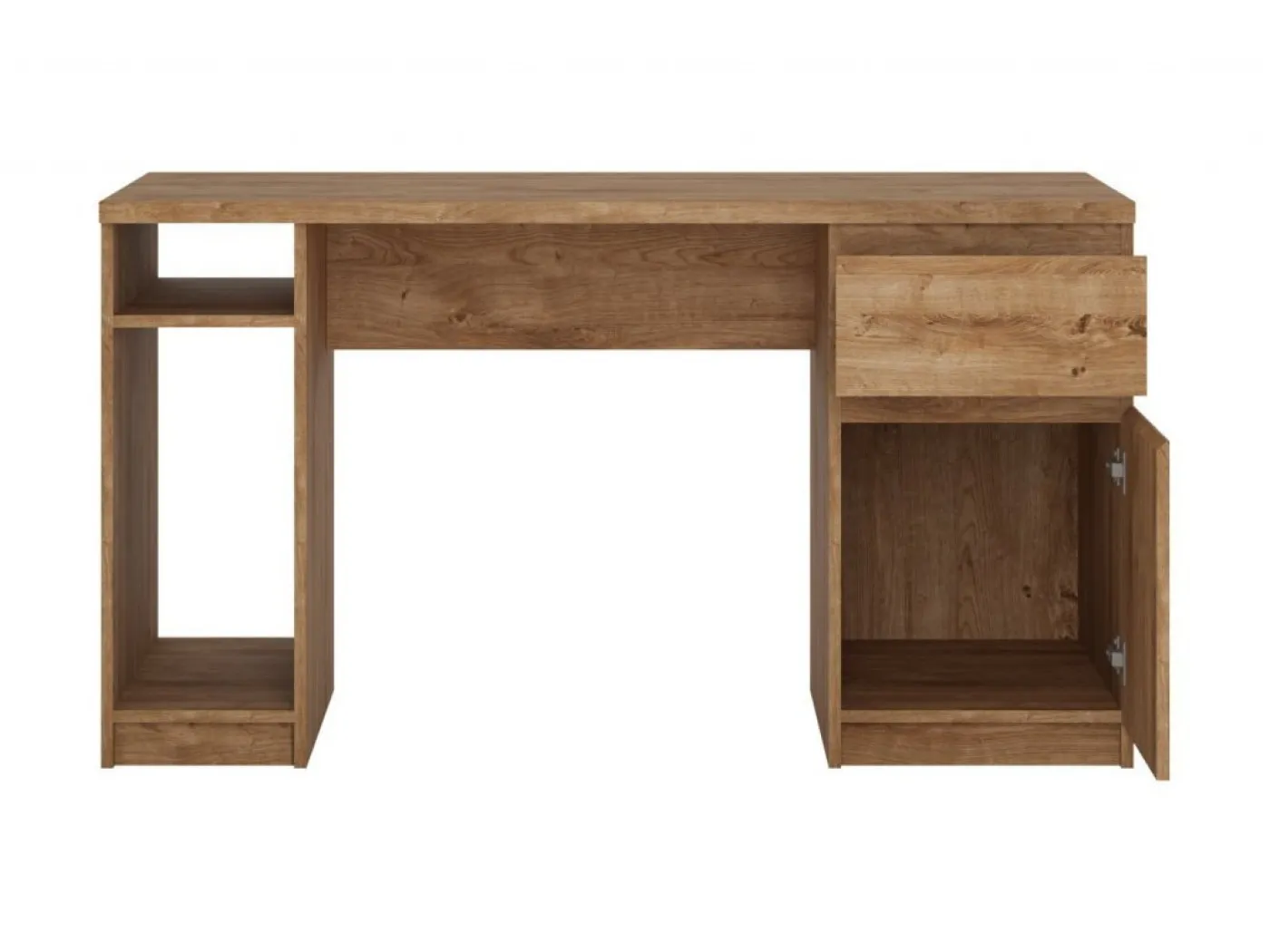 Na levi strani mize se nahaja odprta niša za shranjevanje z eno polico. Na desni strani mize se nahaja en z vrati zaprt del in en predal.
