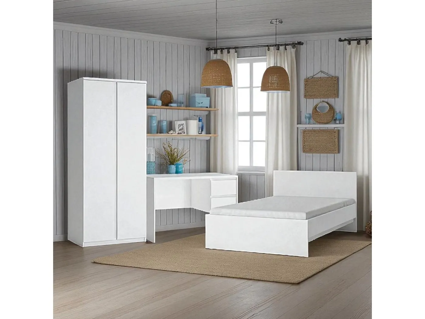 Set za mladinsko sobo FRIBO je elegantna, praktična in kakovostno izdelana rešitev za opremo mladinske ali študentske sobe. Set vsebuje posteljo dimenzije 120x200 cm, letveno dno, vzmetnico, omaro ter pisalno mizo. Pohištvo je izdelano iz kakovostne iverne plošče v mat beli barvi.