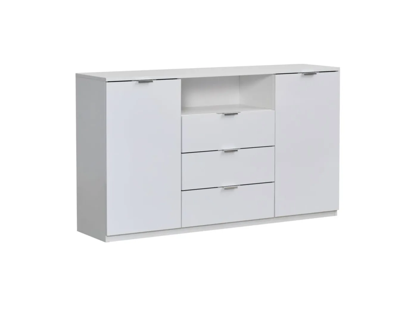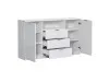 Levi in desni del sta zaprta z vrati, v notranjosti pa se nahajata po 2 dodatni polici. Sredinski del komode sestavljajo 3 predali in odprta niša za odlaganje.