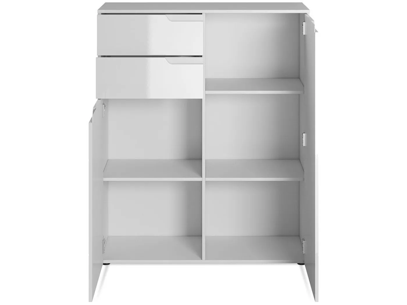 Komoda je razdeljena na dva dela. Levi del ponuja 2 predala in z vrati zaprt del, v katerem se nahaja 1 polica. Desni del je zaprt z vrati, v notranjosti pa se nahajata 2 polici.