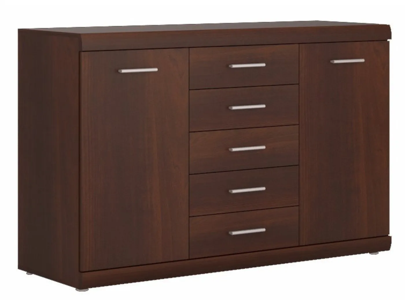 Elegantna komoda z 2 vrati in 5 predali v barvi oreh Imperial. Komoda odlikuje kakovostna izdelava in praktičnost, saj nudi ogromno prostora za shranjevanje. Letvica na vrhu in dnu komode je izdelana iz materiala MDF, kar daje komodi prijeten zaobljen videz. Izdelana je iz kakovostne iverne plošče, ki je odporna na praske. Za boljšo zaščito pred vlago je komoda postavljena na nogice iz plastike.