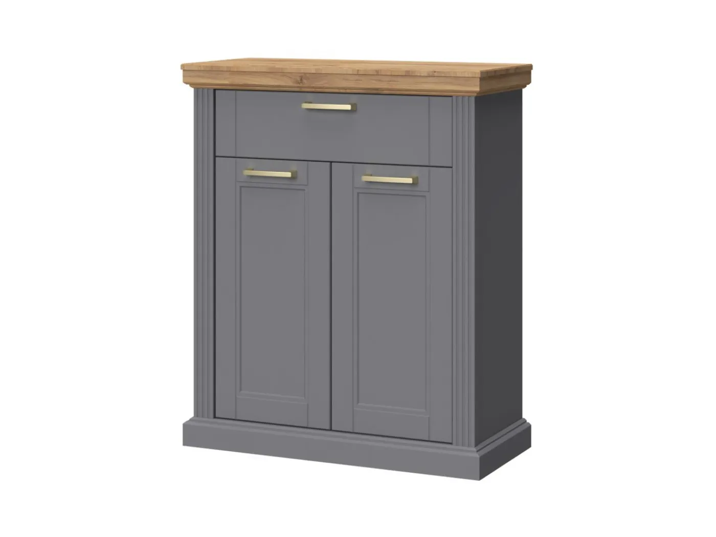 Komoda Tara CPL21 je praktična rešitev za predsobo v modernem podeželjskem slogu. Korpus je izdelan iz iverne plošče debeline 18 mm, vrata ter profilirane okrasne stranice so izdelane iz medijapana debeline 25 mm. Pokrivna plošča je izdelana v barvi Pacifik hrast. Postavljena je na nastavljive nogice, ki omogočajo stabilnost tudi na neravnih tleh. Vrata in predal so opremljeni z mehanizmom za mehko zapiranje (soft-close). Notranjost je opremljena z 2 policami.