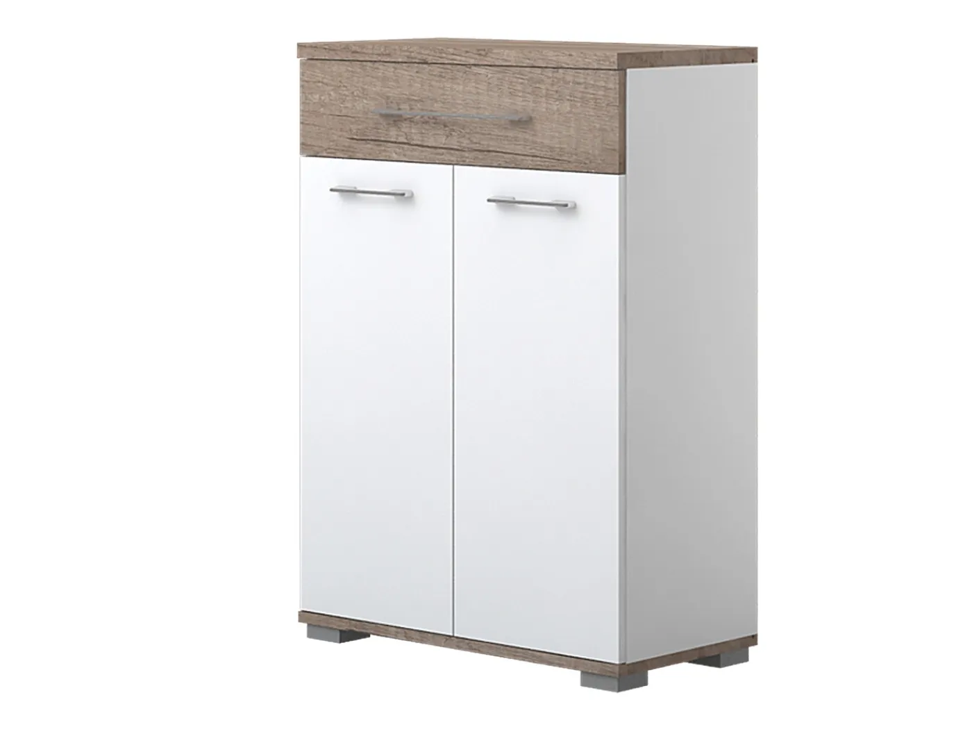Elegantna komoda Azur se odlično kombinira z ostalimi elementi iz programa za predsobe Azur, lahko pa se tudi uporabi kot samostojni element. Izdelana je iz kakovostne iverne plošče debeline 18 mm v beli barvi z strukturo lesa, poudarki pa so v barvi hrast nebraska. Omarica je za dodatno zaščito pred vlago postavljena na nogice, ki so tudi nastavljive, kar omogoča stabilnost tudi na ne popolnoma ravnih tleh. Omarica ima mehko zapiranje vrat in predalov.