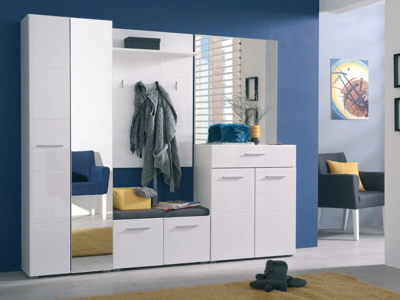 Praktična omara za predsobo Beny nudi praktičen prostor tako za obešanje plaščev kot tudi odlaganje čevljev in drugih predmetov. Omara ima obod v mat beli barvi, ličnice pa so v sijaj beli barvi s privlačnimi poudarki. Na sprednji strani omare se nahaja tudi ogledalo. Omara je izdelana iz kakovostne iverne plošče. Omara Beny 2K OG je del programa pohištva za predsobe Beny.