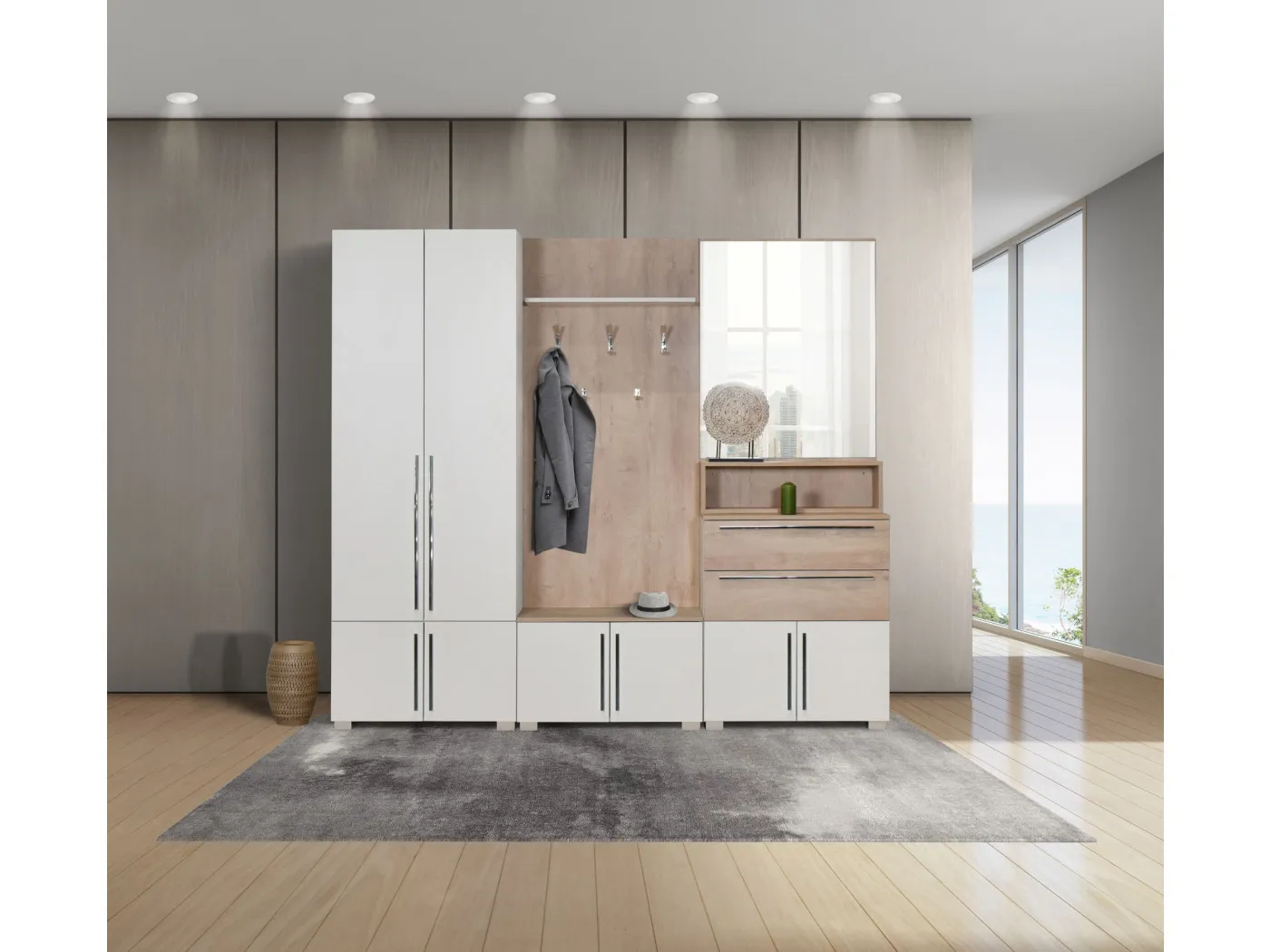 Predsoba Leonidas združuje modern dizajn, praktičnost in kakovostno izdelavo. Predsoba je izdelana iz kakovostne iverne plošče debeline 18 mm v mat beli barvi s poudarki v barvi Premium hrasta. Elementi so postavljeni v plastične noge, ki omogočajo nastavitev in omogočajo trdno postavitev tudi na neravnih tleh, hkrati pa elemente ščitijo pred vlago. Nadstandardna višina elementov (215 cm) ponuja dober izkoristek prostora.