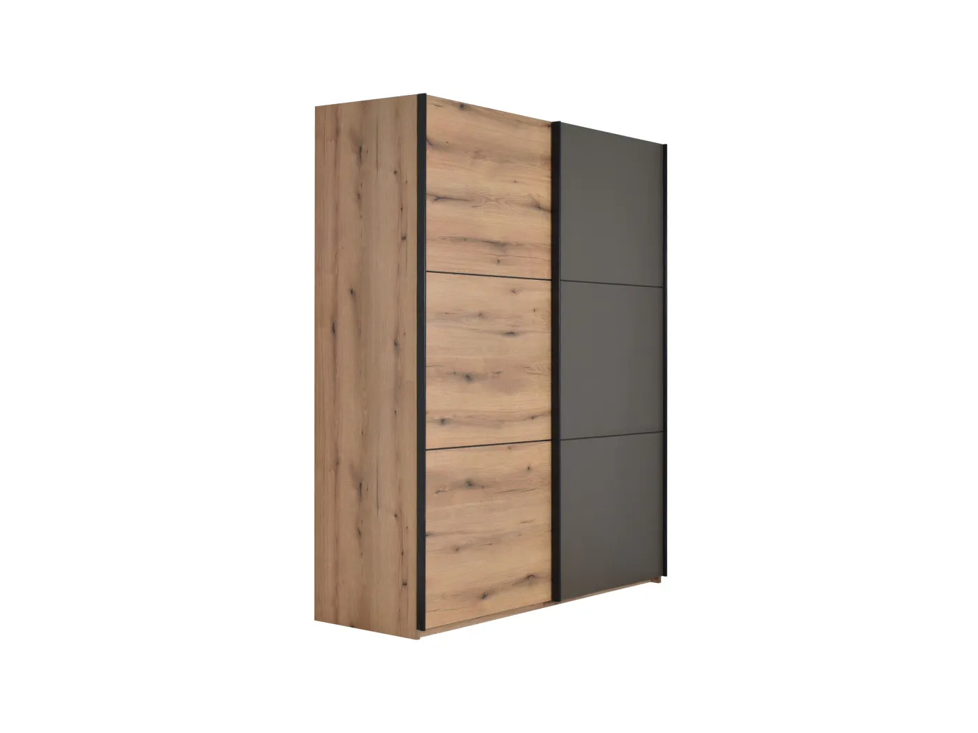 Drsno omaro AP180 odlikuje kakovostna izdelava, modern dizajn in veliko praktičnega prostora za shranjevanje. Omara je izdelana iz kakovostne iverne plošče debeline 18 mm v barvni kombinaciji hrast artisan in temno sive. Kovinski profili na vratih so v črni barvi. Omara je opremljena s kakovostnih drsnim mehanizmom nemškega proizvajalca Hettich. Vrata so opremljena s sistemom za mehko zapiranje.