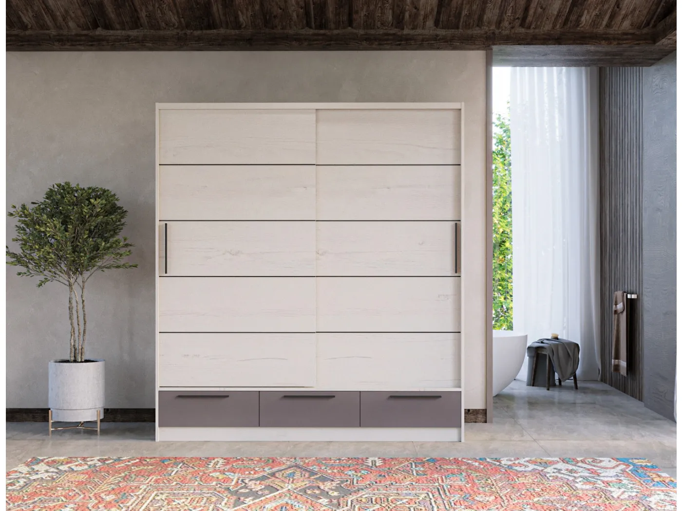 Drsna omara Lara 150 združuje eleganten dizajn, kakovostno izdelavo in praktične rešitve za shranjevanje. Posebnost omare je kombinacija drsnih vrat in 3 praktičnih predalov na spodnjem delu omare. Omara je nadstandardne višine 220 cm, kar omogoča boljši izkoristek prostora. Omara je izdelana iz kakovstne iverne plošče debeline 18 mm v barvi snežni hrast s poudarki v temno sivi barvi. Ročaji in detajli na vratih so v mat črni barvi.