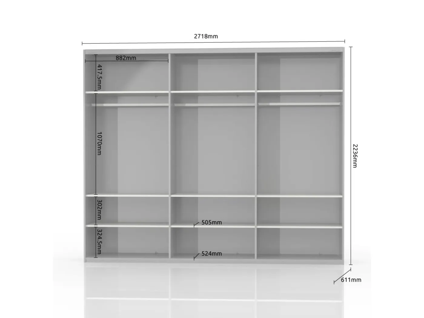 Notranjost je razdeljena na 3 dele. Vsak del je opremljen s 3 policami ter 1 palico za obešanje. Notranjost je mogoče dodatno opremiti z dodatnimi policami FV-GL.
