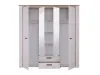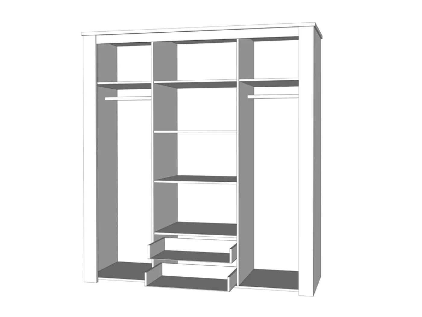 Notranjost omare je razdeljena na 3 dele. Levi in desni del vsebujeta po 1 polico ter 1 palico za obešanje. Sredinski del vsebuje 3 police ter 2 predala.