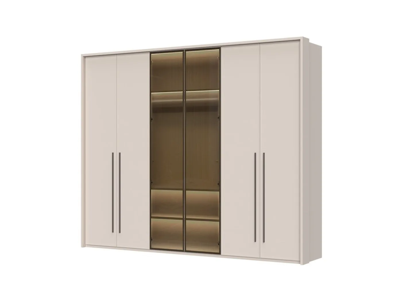 Omara Opera P6A-2AL/OP je moderna in praktična rešitev za spalnico. Omara je izdelana iz kombinacije iverne plošče debeline 18 mm in 25 mm in lakirana z visokokakovostnim UV lakom v barvi kašmir s soft-mat površino. Ličnice so dekorativno profilirane z mdf robom. Omara je opremljena z nastavljivimi nogicami, kar omogoča stabilnost tudi na neravnih tleh. Omara je opremljena z mehanizmom za mehko zapiranje (soft-close) vrat. Sredinski del omare je zaprt s steklenimi vrati, notranjost pa je opremljena z lučkami ki se nahajajo v stropu in polici omare. Za delovanje razsvetljave je potrebno kupiti led napajalnik