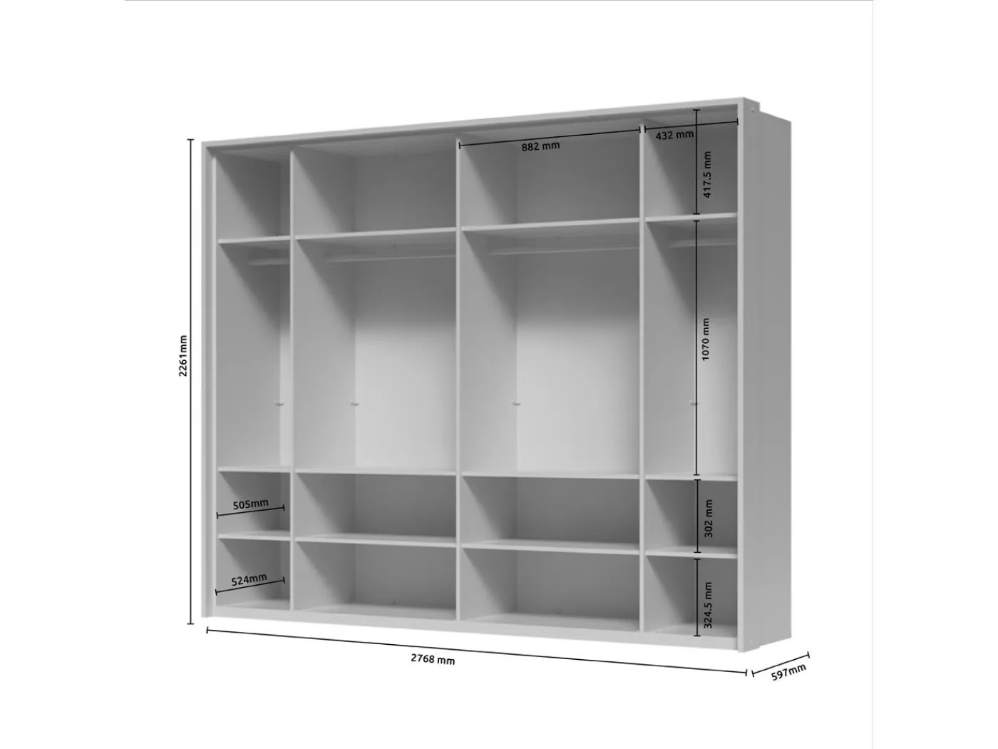 Notranjost omare je sestavljena iz 4 delov, vsak del je opremljen s 3 policami in obešalno palico.