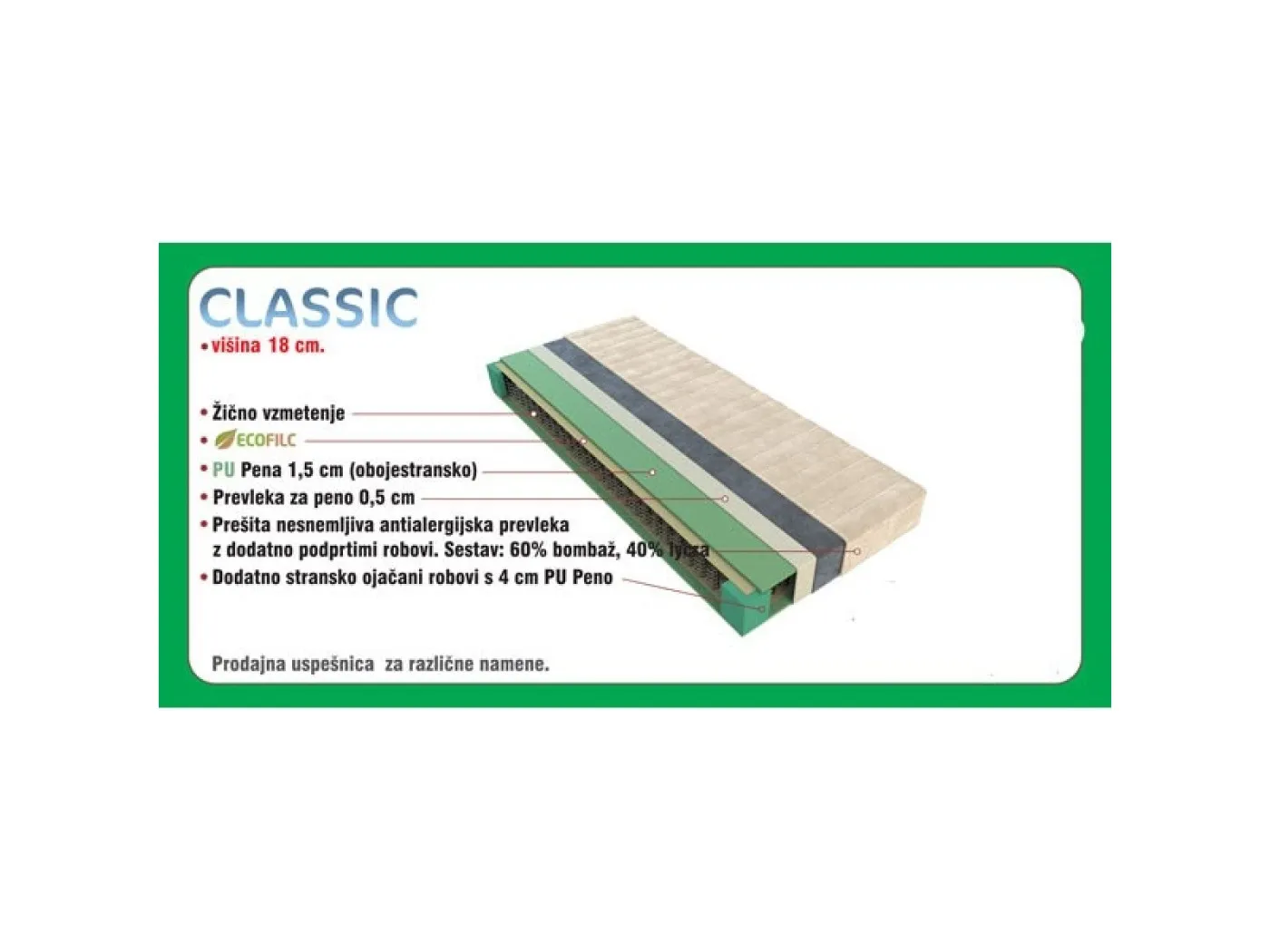 Preprosta in ugodna vzmetnica, katere jedro je sestavljeno iz klasičnih žičnih vzmeti. Višina vzmetnice je 18 cm. Vzmetnica ima nesnemljivo antialergijsko prevleko.