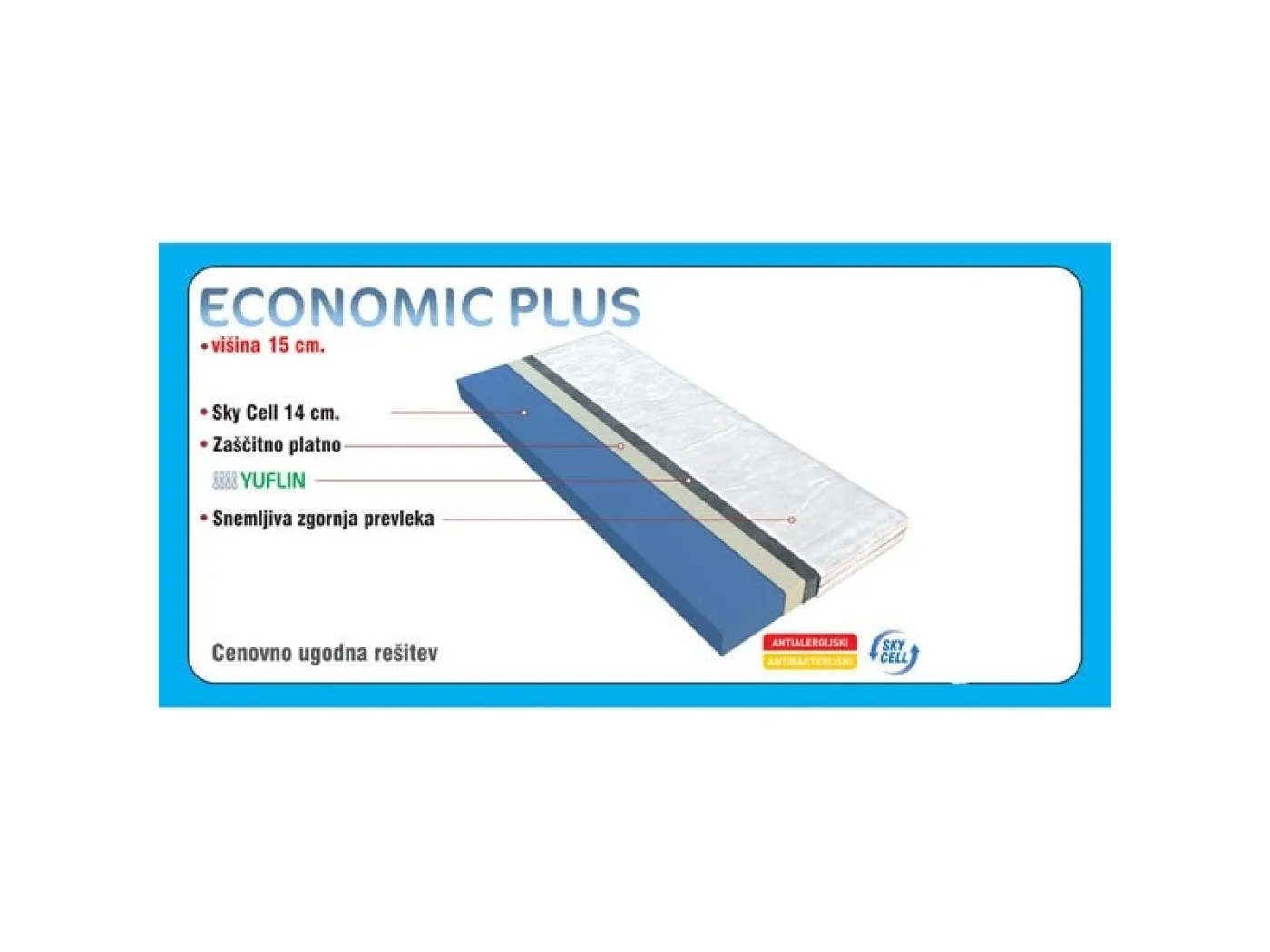 Ležišče iz pene Ekonomik Plus je odlična rešitev za vse, ki iščejo zares ugodno rešitev za spanje. Vzmetnico sestavlja SkyCell pena, prevlečena s zaščitnim platnom ter prevleko, ki je snemljiva. Prevleka je antialergijska